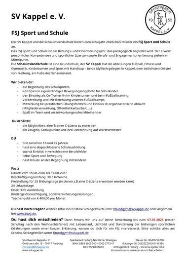Der SV Kappel und die Schauinslandschule bieten zum Schuljahr 2025/2026 wieder ein FSJ Sport und Schule an.